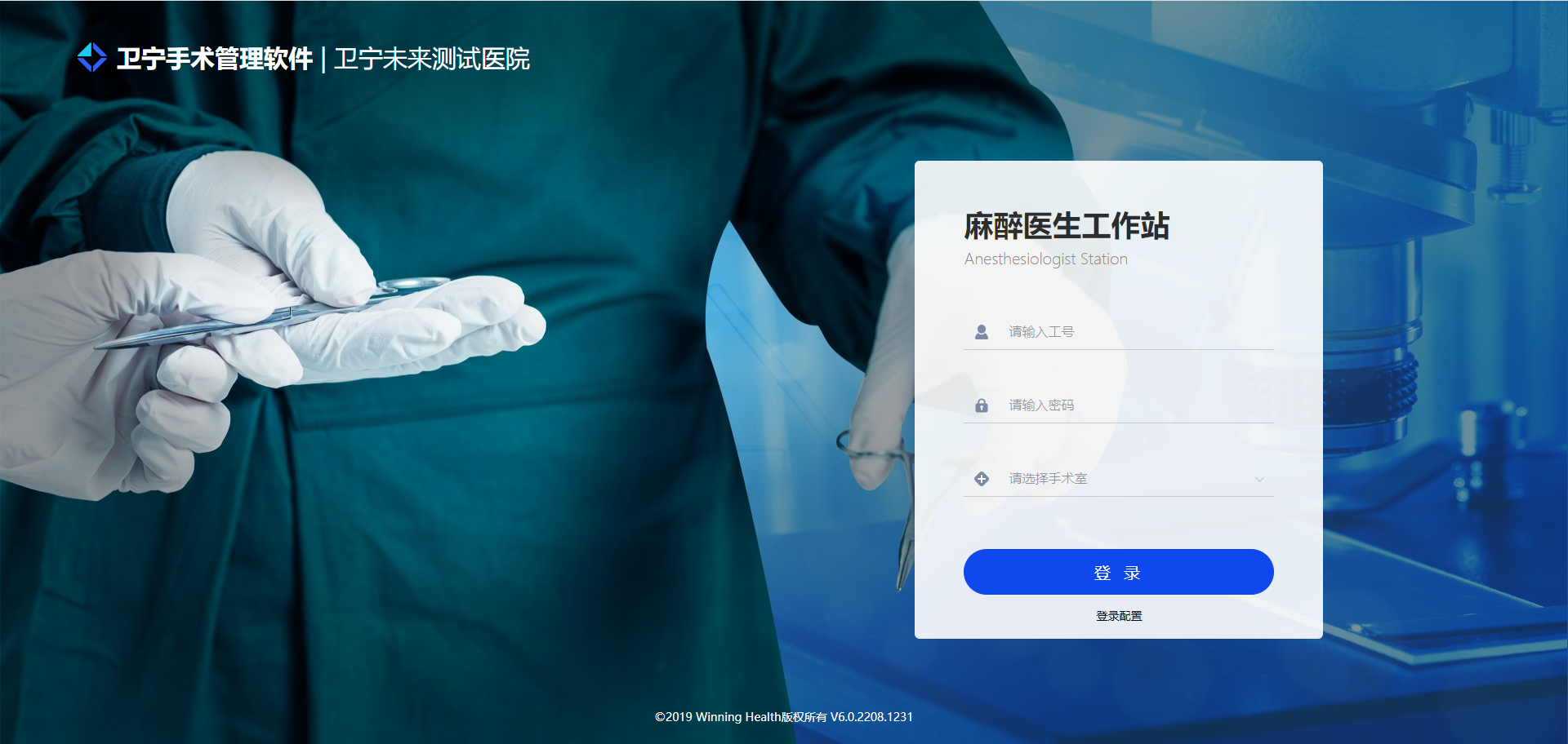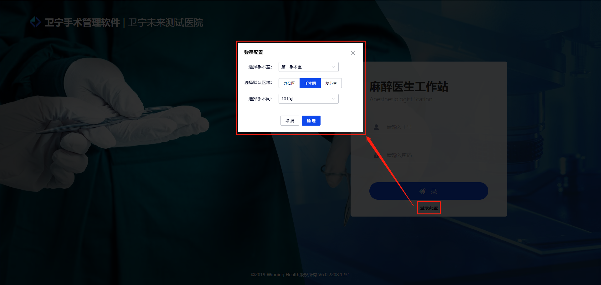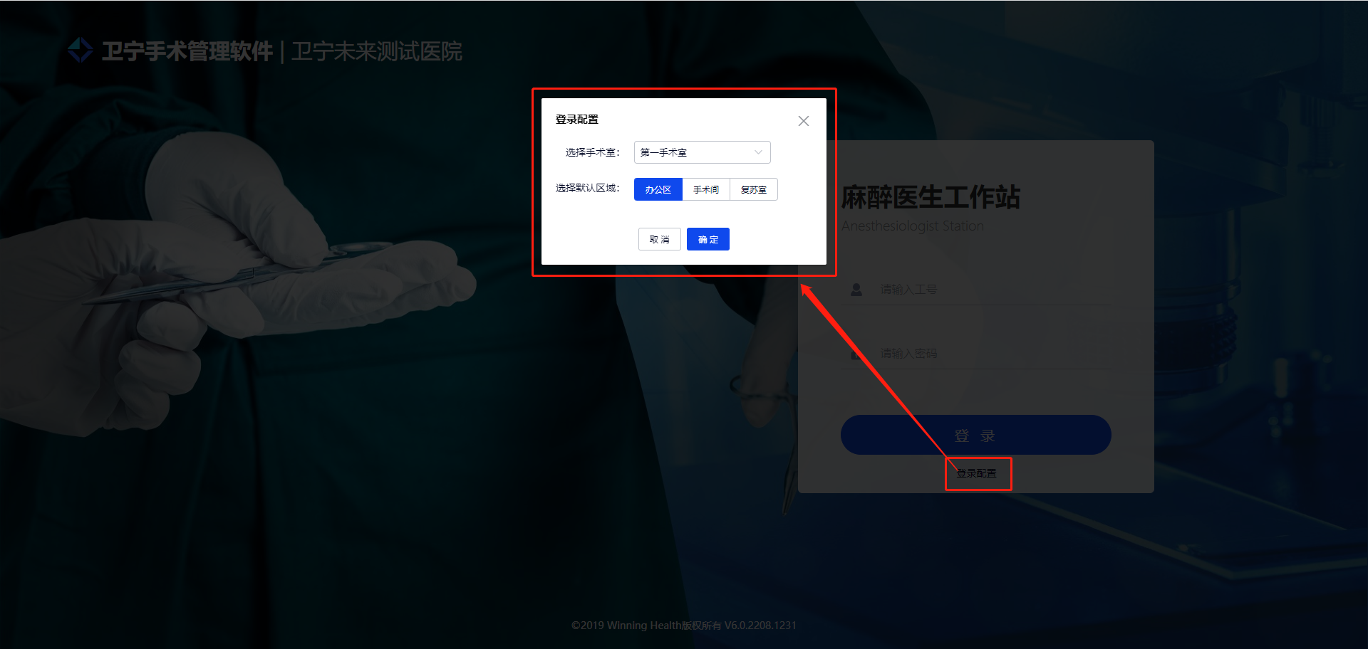 点击 登录配置 ,可选择对应的手术室或工作区域(办公区、手术室、复苏室)。