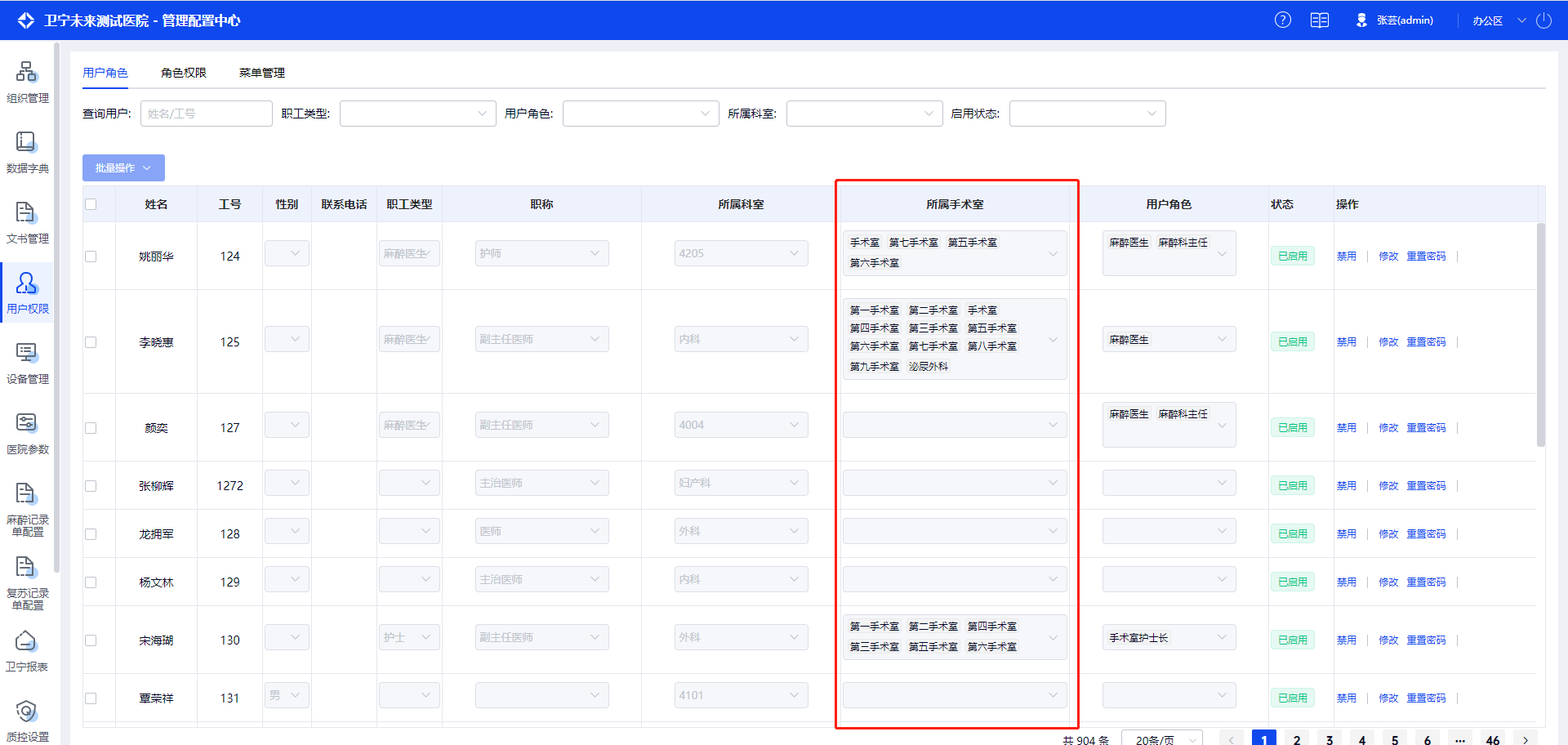 进入配置管理中心->用户权限->用户角色页面,可配置人员手术室设置,如下图: