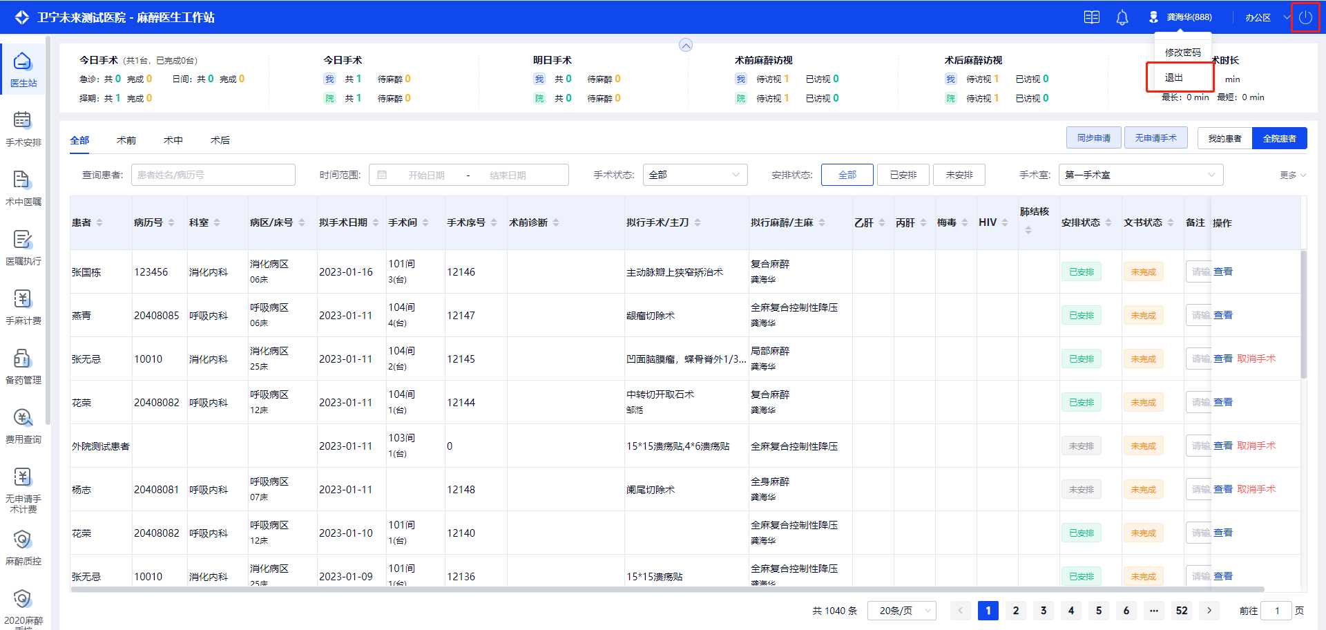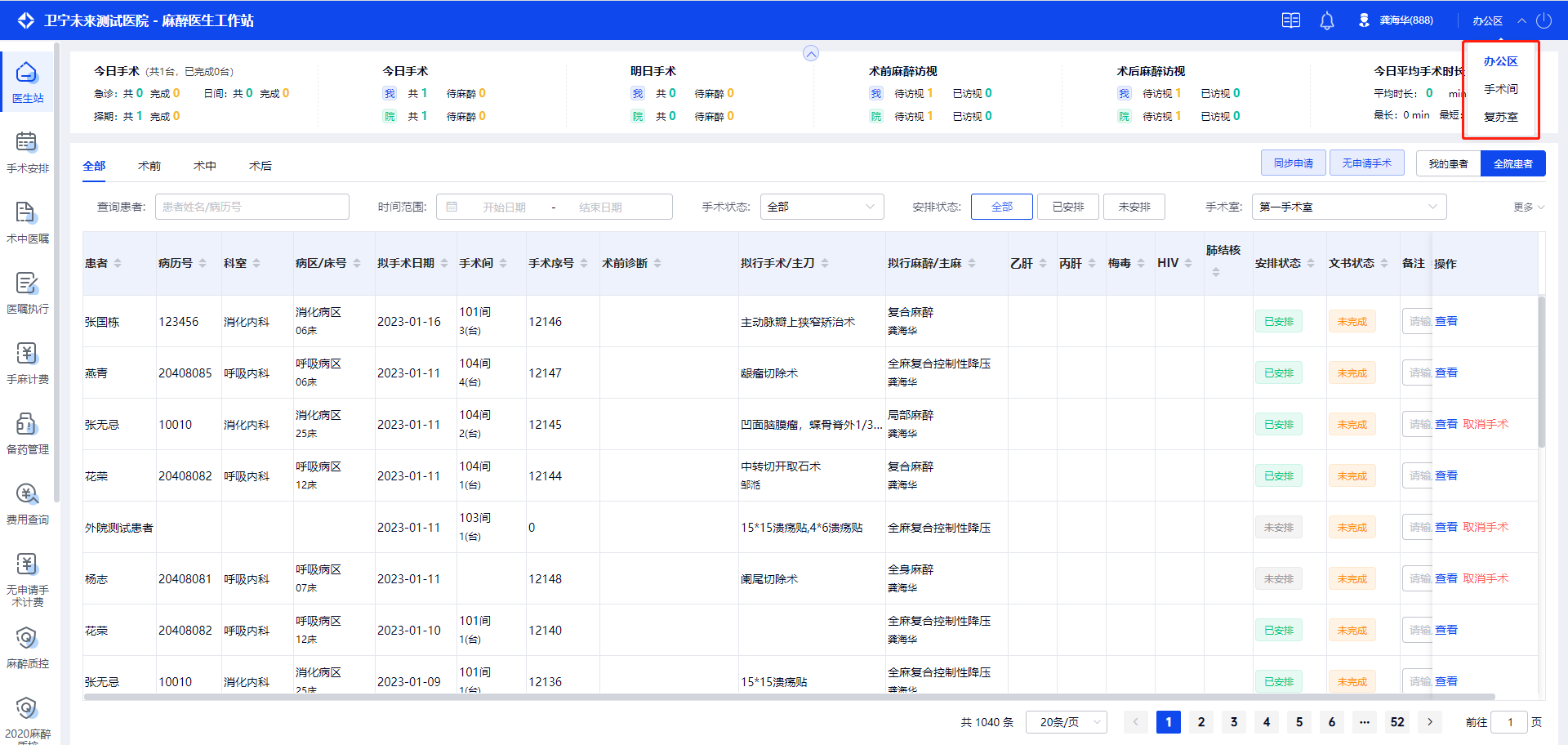 点击右上角的工作站名称,在下拉列表中选择工作站名称,即可切换对应的工作站,如办公区、手术间、复苏室。