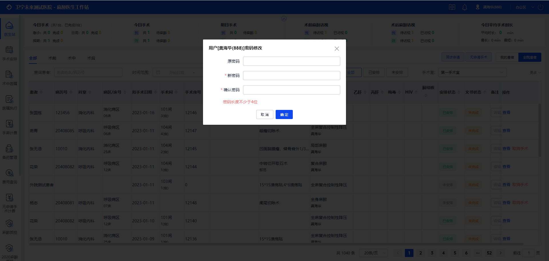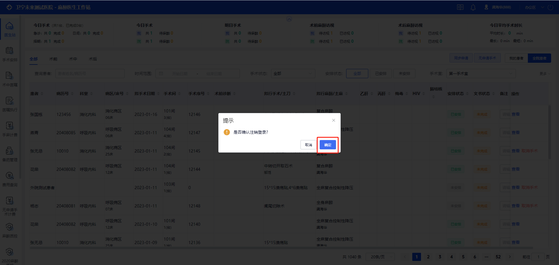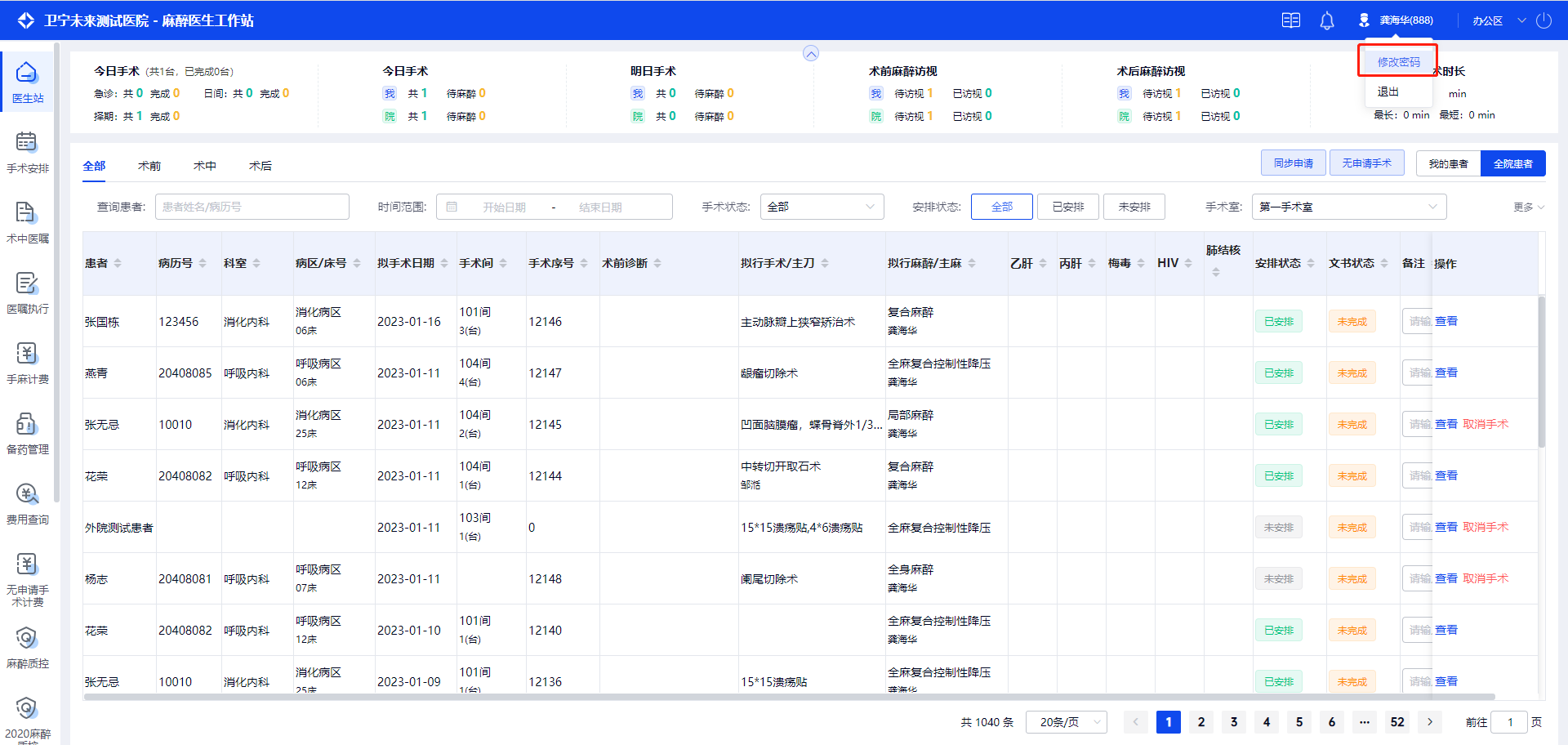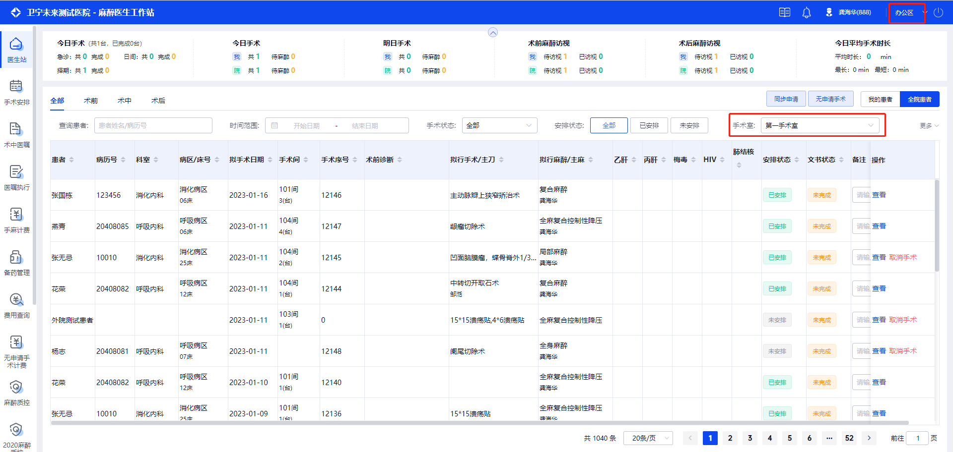如果区域选择“办公区”,并选择默认的手术间“第一手术室”,登录后进入到办公区,工作台数据默认展示“第一手术室”。